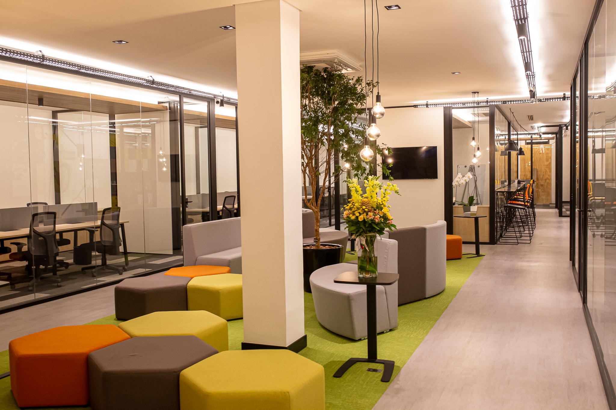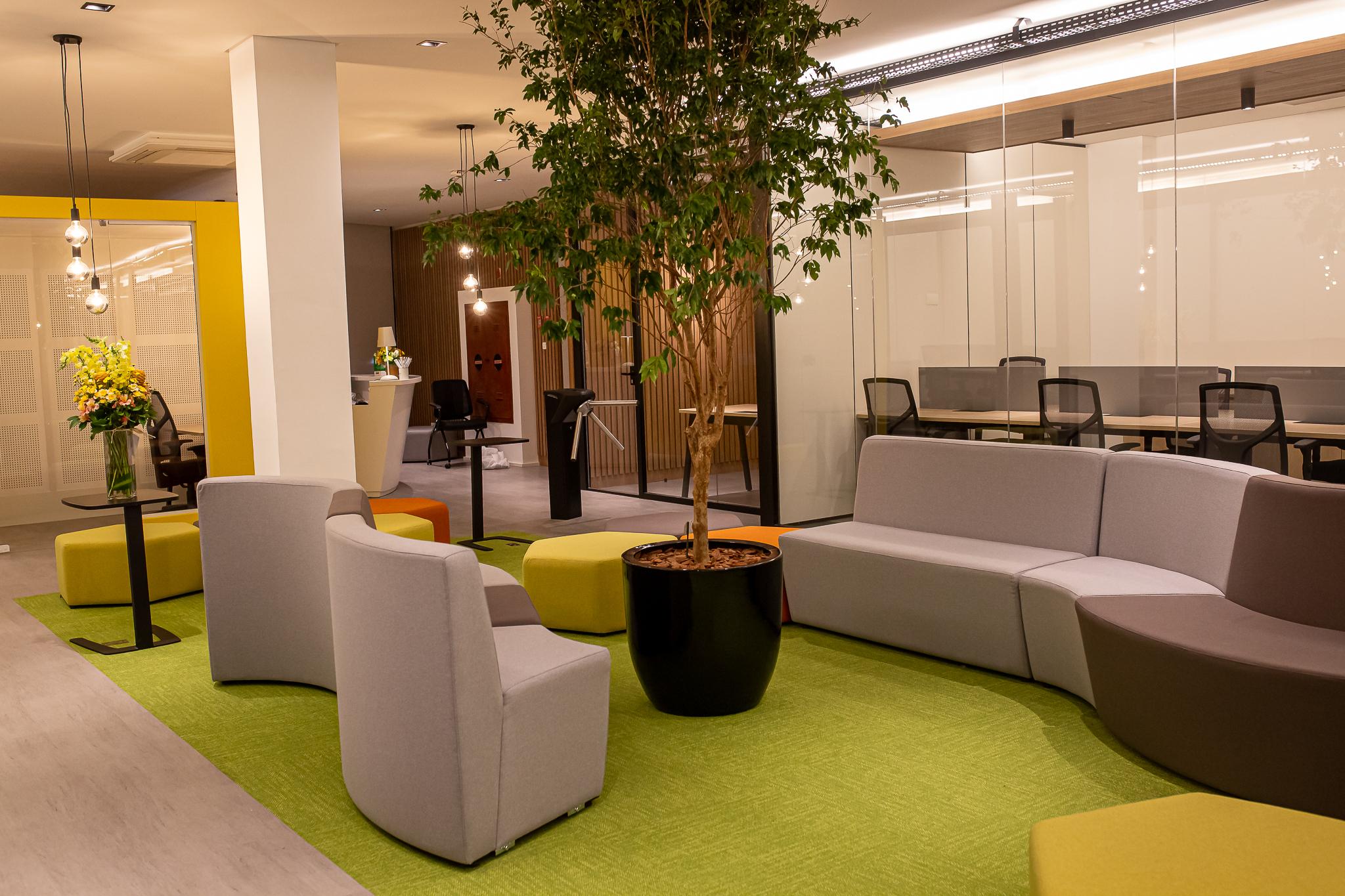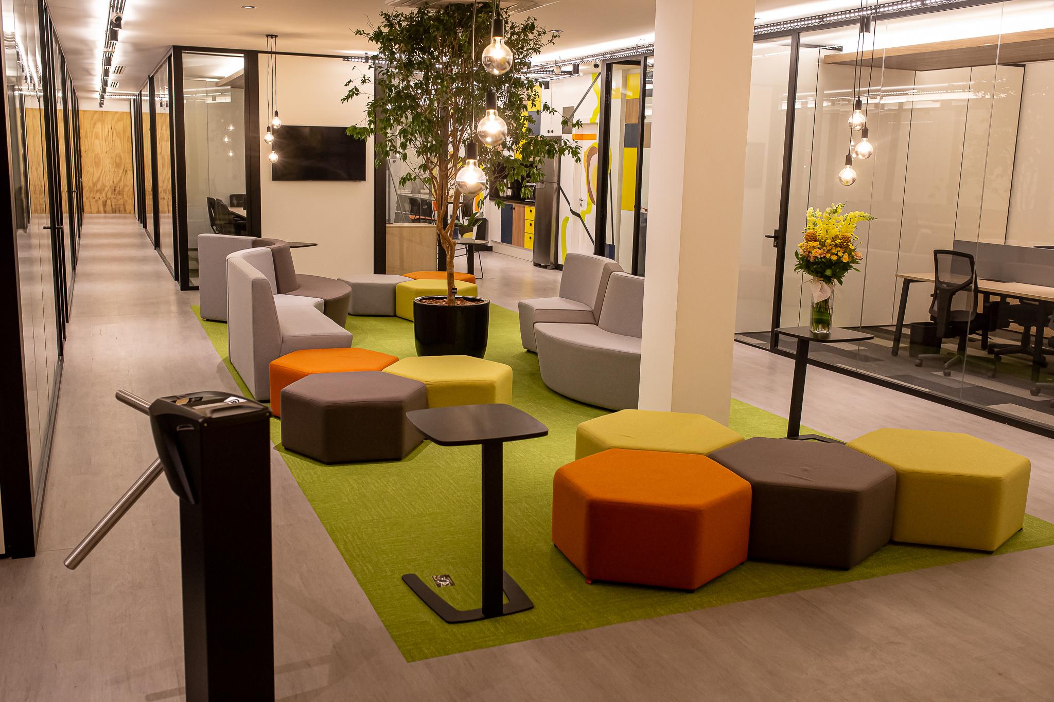 Na recepção encontramos cadeiras giratórias da Linha Cavaletti Yon para a área de atendimento, bem como nas salas de trabalho de uso coletivo e nas cabines individuais. Algumas salas também dispõem de cadeiras de aproximação da Linha Cavaletti Flip. Já a recepção conta com puffs hexagonais da linha Cavaletti Fun, os quais estão dispostos também na área de descontração juntamente com os sofás da Linha Cavaletti Spin e mesas da Linha Cavaletti Talk.