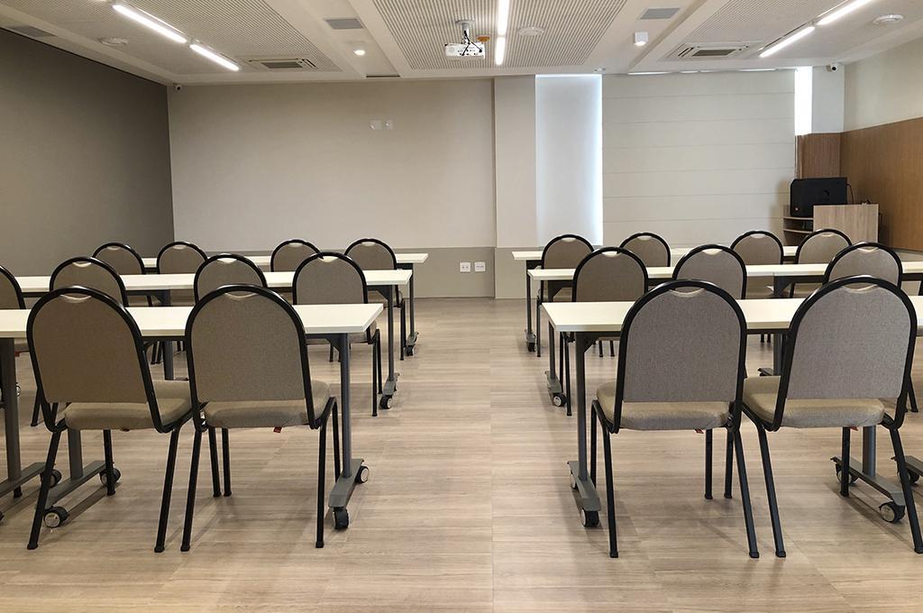 A Unidade Administrativa, responsável pela Gestão da Cooperativa, ocupa todo o primeiro pavimento. Com layout muito funcional, flexível e integrado abriga as salas da Presidência, dos diretores, de Reunião da Diretoria e demais colaboradores. O segundo pavimento, auditório, está equipado para receber até 180 pessoas sentadas em ambiente único, integrado ou compartilhado através de divisória articulada onde dois eventos podem acontecer simultaneamente. “É local para treinamentos de equipes e desenvolvimento de novas ideias. Conta com um amplo espaço de convivência, integração pós-reuniões de grandes grupos e está equipado com uma cozinha gourmet que dá apoio aos eventos”, ressalta a arquiteta. Neste pavimento, o mobiliário é leve, colorido, inovador e permite flexibilidade de layout e diferentes possibilidades de uso. É também um espaço para contemplação e descompressão para as pessoas se sentirem acolhidas, de modo a melhorar a produtividade e a interação.