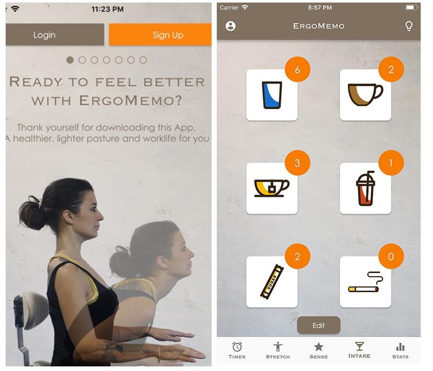 ErgoMemo é o aplicativo que estimula você a ter hábitos saudáveis como ingerir água, além de orientações de alongamento e como manter uma boa postura.