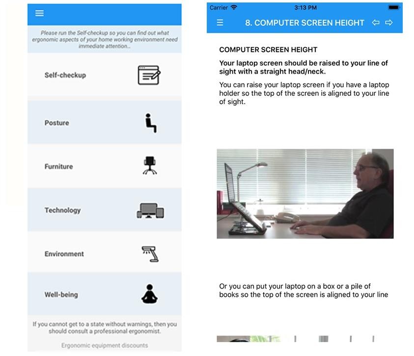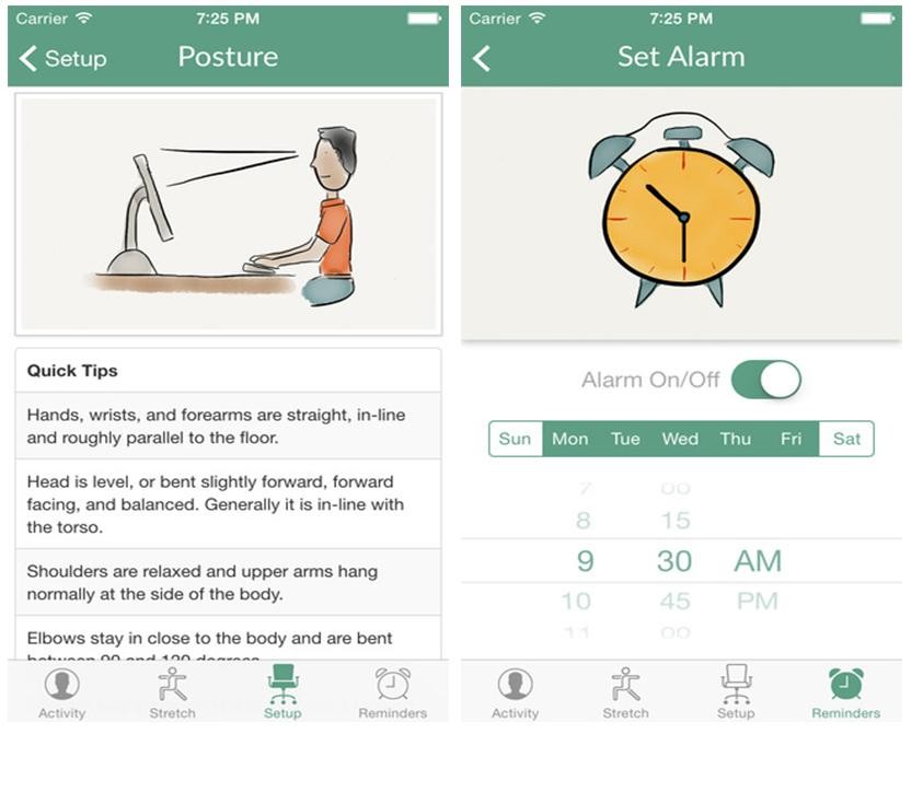 Esse aplicativo traz desde orientações sobre postura a exercícios de alongamento apropriados para o ambiente de trabalho, passando ainda por sugestões para manter a postura correta e lembretes para interromper por breves instantes o trabalho para fazer pequenos movimentos.