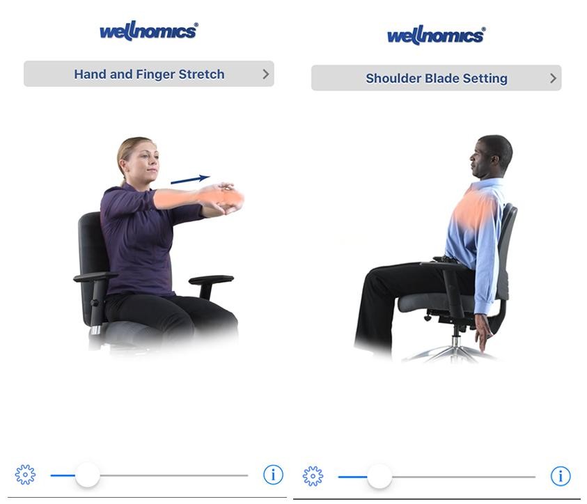 O Wellnomics fornece uma série de dicas com imagens com exercícios, alongamentos e pausas para serem realizados durante o trabalho.