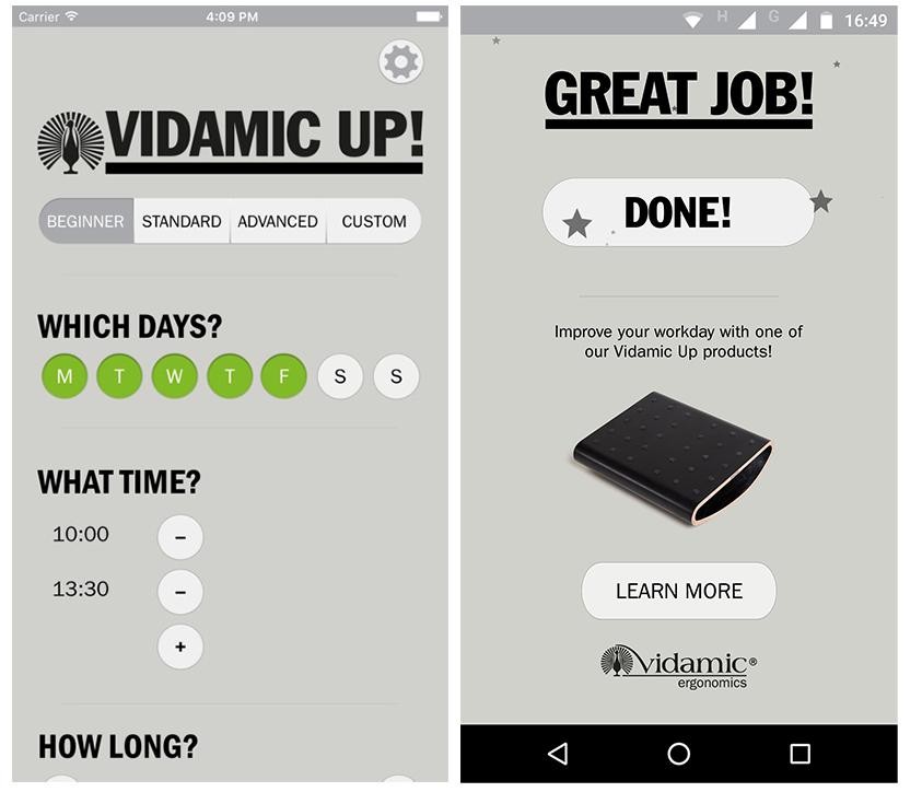 Com alerta para o usuário sobre movimentos e pausas, o aplicativo “Vidamic UP!” é fácil de usar e tem três alternativas pré-programadas ou também pode personalizar sua própria programação que funcione melhor para você, selecionando os dias e horas que correspondem ao seu dia de trabalho.