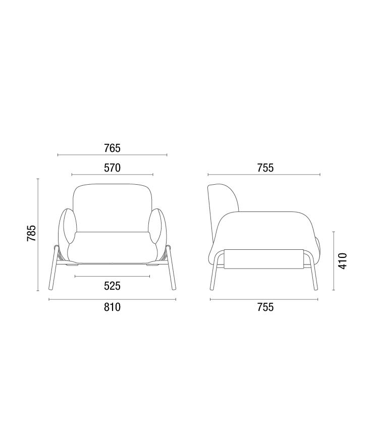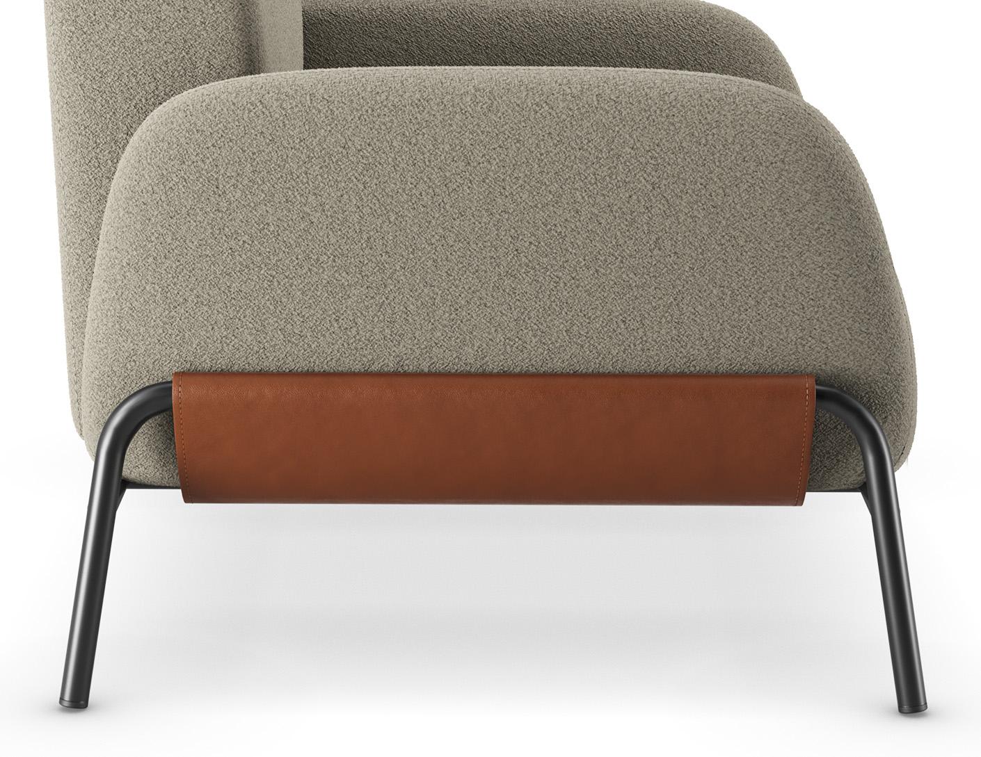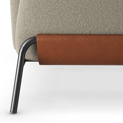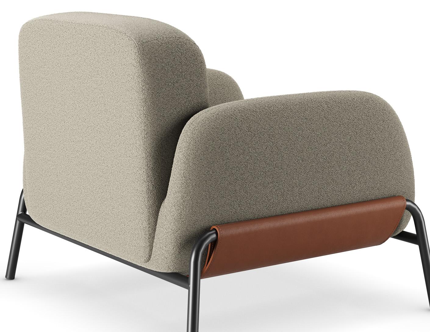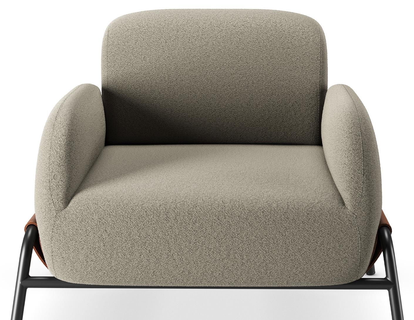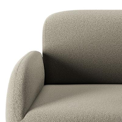 Com formas envolventes, o assento e o encosto oferecem acolhimento visual e conforto no uso. O estofado contínuo valoriza a sensação de maciez e convida à permanência.