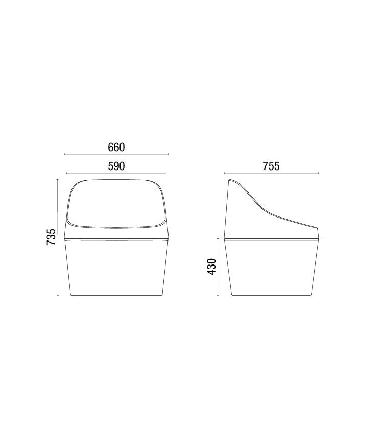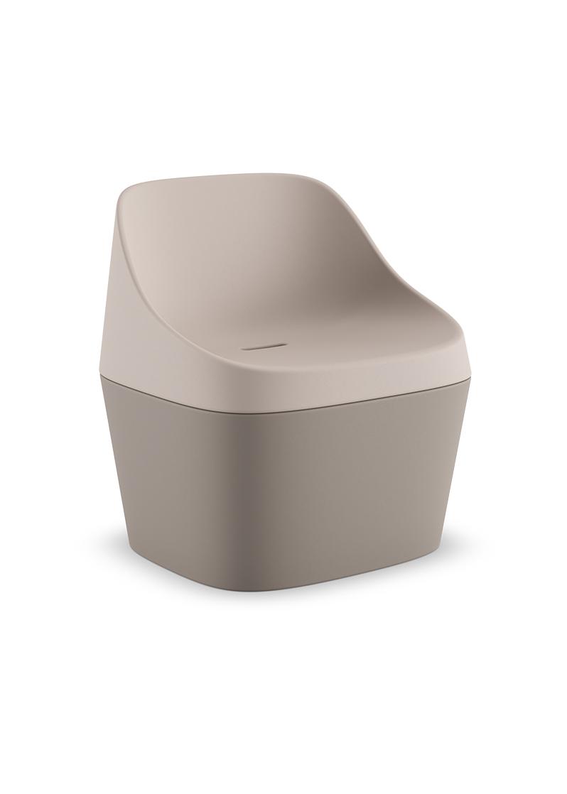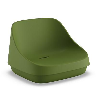 Produzido em polietileno por meio do processo de rotomoldagem, o assento possui superfícies orgânicas e linhas marcantes que equilibram conforto informal e presença estética. Sua forma convida ao uso espontâneo, favorecendo momentos de pausa, relaxamento e convivência. Quando combinado à base, compõe uma poltrona de proporção baixa e acolhedora.