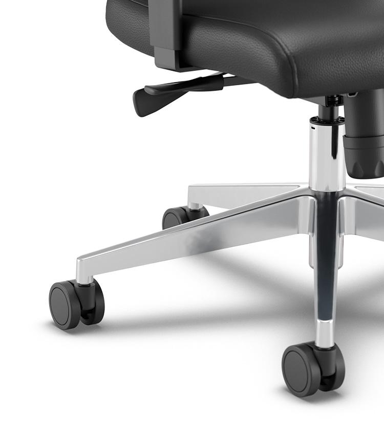 Opções de Bases em Alumínio ou Nylon, com rodízios de 65mm em Nylon ou PU. Base em Aço com Capa, somente rodízios de 50mm em Nylon ou PU. Rodízios de Nylon para uso em pisos com tapetes e carpetes ou PU para uso em pisos frios, madeirados e rústicos.